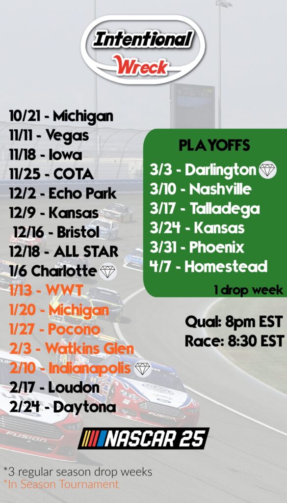 The IWP NASCAR 25 League runs Tuesday nights at 9pm EST.
